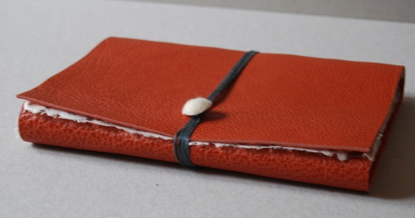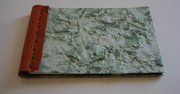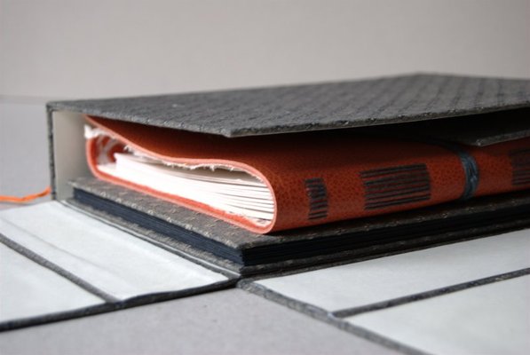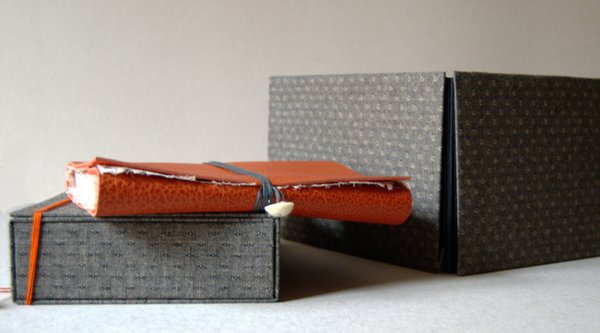 Estuche japonés de cuatro caras que contiene un álbum en acordeón y un libro de viaje encuadernado en piel.